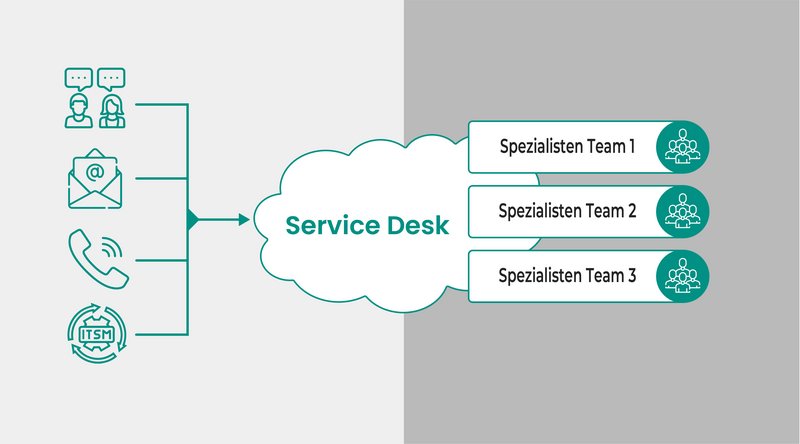 Der Service Desk agiert hier «nur» als sogenannter Verteiler von Anfragen. Er stellt unter Umständen den Flaschenhals dar, sofern viel mehr Anfragen eintreffen, als verarbeitet werden können.